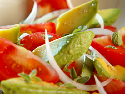 Slice avocadoes, tomatoes, and the sweet onion. Combine in a bowl and drizzle vinaigrette or dressing, and olive oil. Squeeze the juice of the lemon onto the salad. Add salt and peper and gently toss.